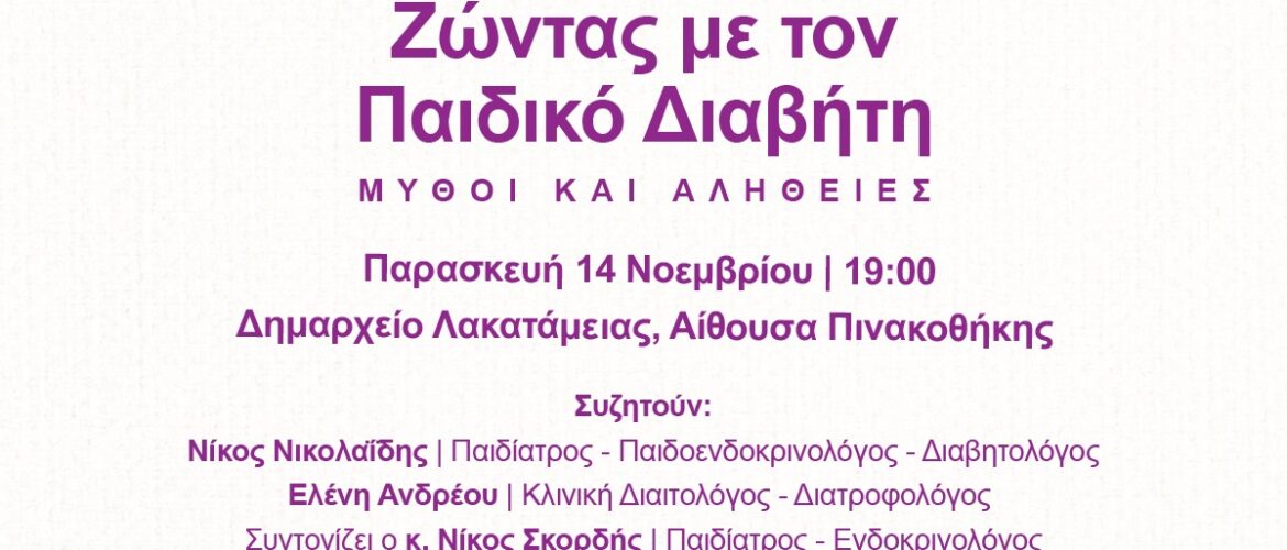 Στα πλαίσια της Παγκόσμιας Ημέρας Διαβήτη, το Despina Children’s Diabetes Foundation σε συνεργασία με το Δημαρχείο Λακατάμειας, σας προσκαλεί σε μια ανοιχτή συζήτηση με θέμα:«Ζώντας με τον Παιδικό Διαβήτη: Μύθοι και Αλήθειες» ![]()